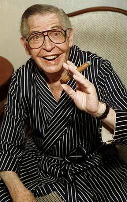 Milton Berle (12 de julio de 1908 – 27 de marzo de 2002) fue un actor y comediante Americano. Milton Berle nació en una familia judía en un edificio sin ascensor de cinco pisos en 68 W. 118th Street en el barrio de Harlem de Manhattan. Su primer nombre fue Mendel Berlinger. Eligió Milton Berle como su nombre profesional cuando tenía 16 años. Su padre, Moses Berlinger, era vendedor de pinturas y barnices. Su madre, Sarah (Sadie) Glantz Berlinger cambió su nombre a Sandra Berle cuando Milton se hizo famoso. Tenía tres hermanos mayores. Berle ingresó al mundo del espectáculo a la edad de cinco años en 1913 cuando ganó una competencia infantil de Charlie Chaplin. También trabajó como modelo infantil y fue «Buster Brown» para los zapatos «Buster Brown». Apareció como actor infantil en películas mudas. Afirmó The Perils of Pauline (1914) como su primera aparición cinematográfica. Berle continuó interpretando papeles infantiles en otras películas: Bunny’s Little Brother, Tess of the Storm Country, Birthright, Love’s Penalty, Divorce Coupons, Ruth of the Range. En 1916, Berle se matriculó en la Escuela Infantil Profesional. Alrededor de 1920, a los 12 años, Berle hizo su debut en el escenario en una reposición de la comedia musical Florodora en Atlantic City, Nueva Jersey, que luego se trasladó a Broadway. Cuando tenía 16 años, trabajaba como maestro de ceremonias en el vodevil. También se sabe que tuvo pequeños papeles en varias películas mudas en las décadas de 1910 y 1920. En 1932, protagonizó «Vanities» de Earl Carrol, un musical de Broadway. A principios de la década de 1930, era un exitoso comediante. De 1934 a 1936, Berle apareció con frecuencia en The Rudy Vallee Hour y atrajo publicidad como invitado habitual en The Gillette Original Community Sing, un programa de variedades de comedia los domingos por la noche transmitido por CBS del 6 de septiembre de 1936 al 29 de agosto de 1937. En 1939, fue el presentador de Stop Me If You’ve Heard This One con panelistas que terminaban espontáneamente los chistes enviados por los oyentes. En 1951, NBC lo firmó con un contrato de televisión exclusivo y sin precedentes de 30 años por $ 1 millón al año. Cuando el renombrado Milton Berle Show terminó su única temporada completa (1955-56), Berle ya estaba haciendo historia, aunque su última temporada acogió dos de las primeras apariciones televisivas de Elvis Presley, el 3 de abril y el 5 de junio de 1956. En 1960 , se vio reducido a presentar un programa de bolos, Jackpot Bowling. Apareció en numerosas películas, entre ellas Siempre déjalos reír (1949), Hagamos el amor, Es un mundo loco, loco, loco, Loco, El amado, El Oscar, ¿Quién se ocupa de la menta?, Lepke (1975), La película de Woody Allen. Broadway Danny Rose, Volviéndome loco. Más tarde apareció como el villano invitado Louie the Lilac en la serie Batman de ABC. Otras apariciones incluyeron The Barbara Stanwyck Show, The Lucy Show, The Jackie Gleason Show, Get Smart, Laugh-In, The Sonny & Cher Comedy Hour, The Hollywood Palace, Ironside, F Troop, Fantasy Island, I Dream of Jeannie, CHiPs, El Show de los Muppets, El Programa Jack Benny. El 14 de abril de 1979, Berle fue el anfitrión invitado de Saturday Night Live de NBC. Después de casarse dos veces y divorciarse de la corista Joyce Mathews, Berle se casó con la publicista Ruth Cosgrove en 1953; ella murió de cáncer en 1989. Se casó con Lorna Adams, una diseñadora de moda 30 años menor que él, en 1992. Tuvo tres hijos. Berle actuó como estrella invitada como el tío Leo en el especial de Kenan & Kel «Two Heads Are Better than None», que se estrenó en 2000. Este sería su último papel actoral. En abril de 2001, Berle anunció que se había encontrado un tumor maligno en su colon, pero rechazó la cirugía. Un año después del anuncio, el 27 de marzo de 2002, Berle murió en Los Ángeles de cáncer de colon a la edad de 92 años.
