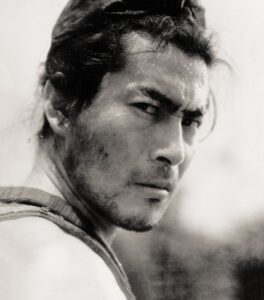 Toshiro Mifune (1 de abril de 1920 – 24 de diciembre de 1997) fue un actor japonés que apareció en más de 150 largometrajes. Toshiro Mifune nació el 1 de abril de 1920 en Qingdao, Shandong, China, que en ese momento todavía estaba bajo ocupación japonesa después de su captura de la ciudad del dominio colonial alemán durante la Primera Guerra Mundial. Con la esperanza de mantener su control sobre la región, el gobierno japonés retuvo una gran guarnición y alentó a los ciudadanos japoneses a mudarse allí con promesas de un trabajo importante y gratificante. Entre los japoneses que vivieron allí antes de que la República de China se apoderara de la ciudad en 1922 estaban los padres de Toshiro, que trabajaban como misioneros metodistas. Mifune creció con sus padres y dos hermanos menores en Dalian, Fengtian, y de 4 a 19 años en Manchukuo. De joven, Mifune trabajó en la tienda de fotografía de su padre Tokuzo, un fotógrafo comercial e importador que había emigrado del norte de Japón. Después de pasar los primeros 19 años de su vida en China, fue reclutado en la División de Aviación del Ejército Imperial Japonés como ciudadano japonés, sirviendo en la unidad de fotografía aérea durante la Segunda Guerra Mundial. En 1947, uno de los amigos de Mifune que trabajaba para el departamento de fotografía de Toho Productions sugirió probar Mifune para el departamento de fotografía. Fue contratado para un puesto como asistente de cámara. En este punto, una gran cantidad de actores de Toho se habían ido después de una larga huelga para formar su propia compañía, Shin Toho. Luego, Toho organizó un concurso de «caras nuevas» para encontrar nuevos talentos. Los amigos de Mifune enviaron una solicitud y una foto sin su conocimiento. Fue aceptado, junto con otros 48 (de aproximadamente 4,000 solicitantes), y se le permitió tomar una prueba de pantalla para Kajirō Yamamoto. Se le instruyó a imitar la ira y se basó en sus experiencias de guerra. Yamamoto amaba a Mifune y lo recomendó al director Senkichi Taniguchi. Esto llevó al primer papel principal de Mifune en Shin Baka Jidai. Mifune conoció al director Akira Kurosawa cuando Toho Studios, la productora cinematográfica más grande de Japón, llevó a cabo una búsqueda masiva de talentos, con cientos de aspirantes a actores audicionando para un equipo de jueces. Kurosawa originalmente iba a saltarse el evento, pero apareció cuando Hideko Takamine le habló de un actor que parecía particularmente prometedor. Entre las compañeras de actuación de Mifune, Sachiko Yoshimine fue una de las 32 mujeres elegidas en el concurso de caras nuevas. Se enamoraron y Mifune pronto le propuso matrimonio. La boda tuvo lugar en febrero de 1950 en l